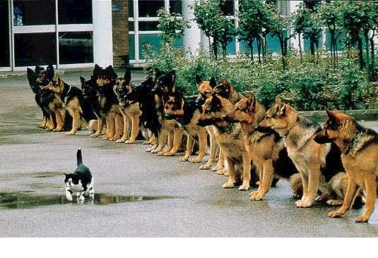 Hai Gitta, ein "Disziplin"Test für Polizei oder BGS -Hunde? Ich möchte nicht in der Haut der Katze stecken wenn nur einer der Hunde losrennt....... Sie scheint aber zu wissen das keiner losrennt....... |